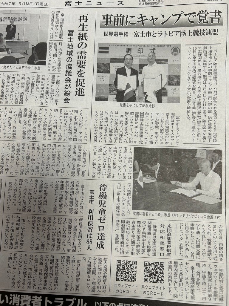 On May 16, Dmitrijs Milkevics, President of the Latvian Athletics Federation, visited Japan to formally sign an agreement with Fuji City, confirming it as the official pre-training camp location for the Tokyo 2025 World Athletics Championships.